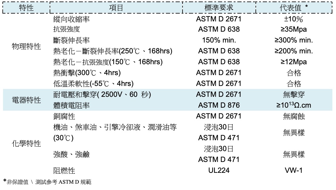 由輻照交聯特種含氟聚合物PVDF製成,具有優異的耐化學腐蝕和耐溶劑性能,是一種堅固、半硬、薄壁、光滑的熱縮管